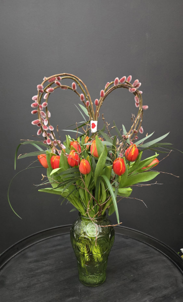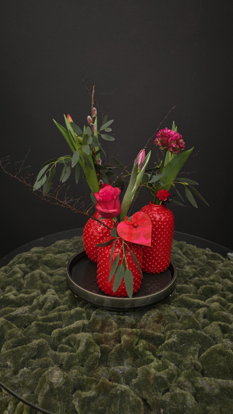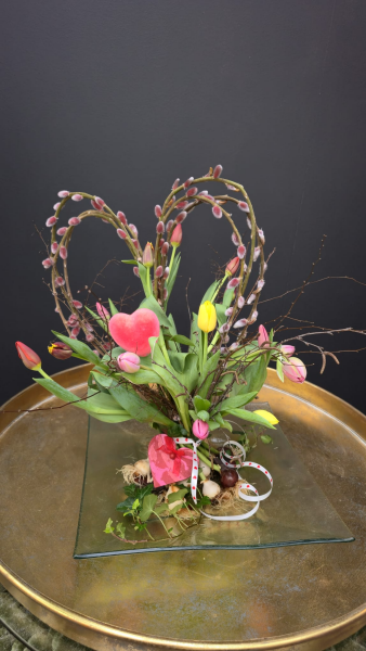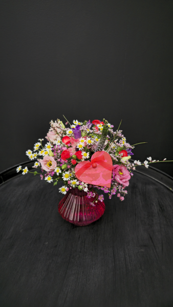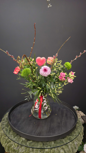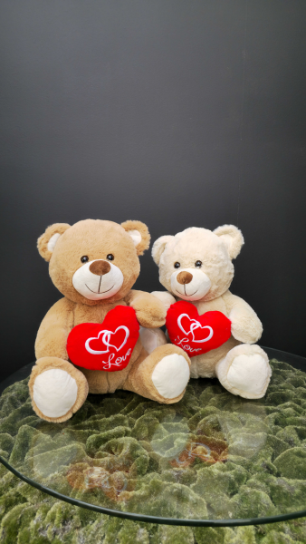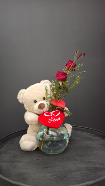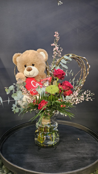 Valentijnsboeket met hart, teddybeer knuffel en chocolade beertje, inclusief vaas.